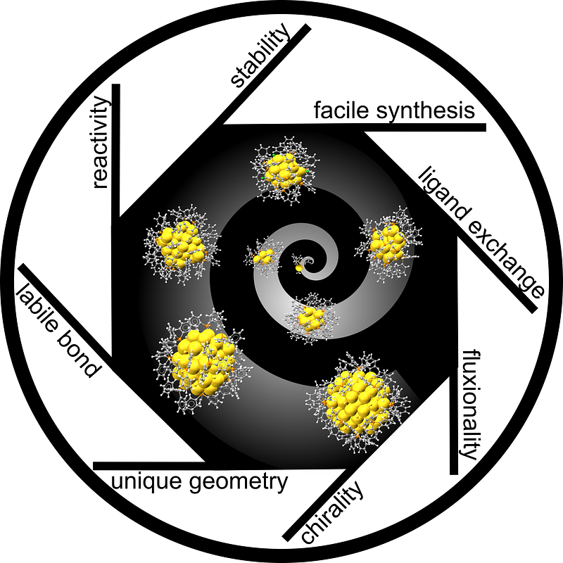 - Superatomic clusters: Synthesis of ligand-protected metal (Au, Ag, Pd, Pt, Ru) clusters using phosphine or some other organic ligands with tunable properties such as size selectivity, electronic and optical properties, chirality and catalytic activity.